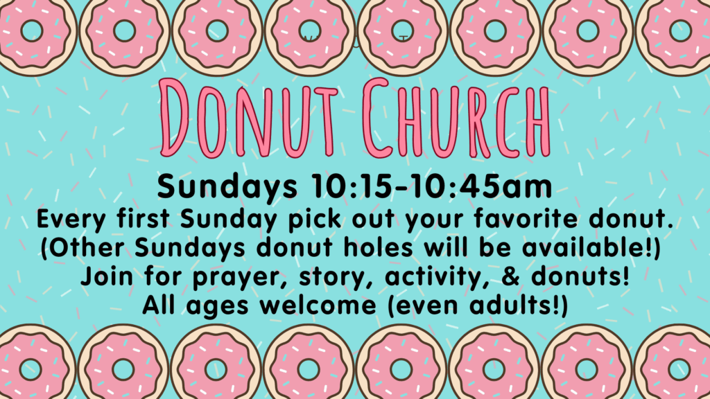 Donut Church September 13, 2025 Join us after worship for donuts, prayer, activity, and a story. All are welcome (even adults!). Donuts served the 1st Sunday of each month, donut holes the following Sundays. We will meet onthe 3rd floor in room 314.