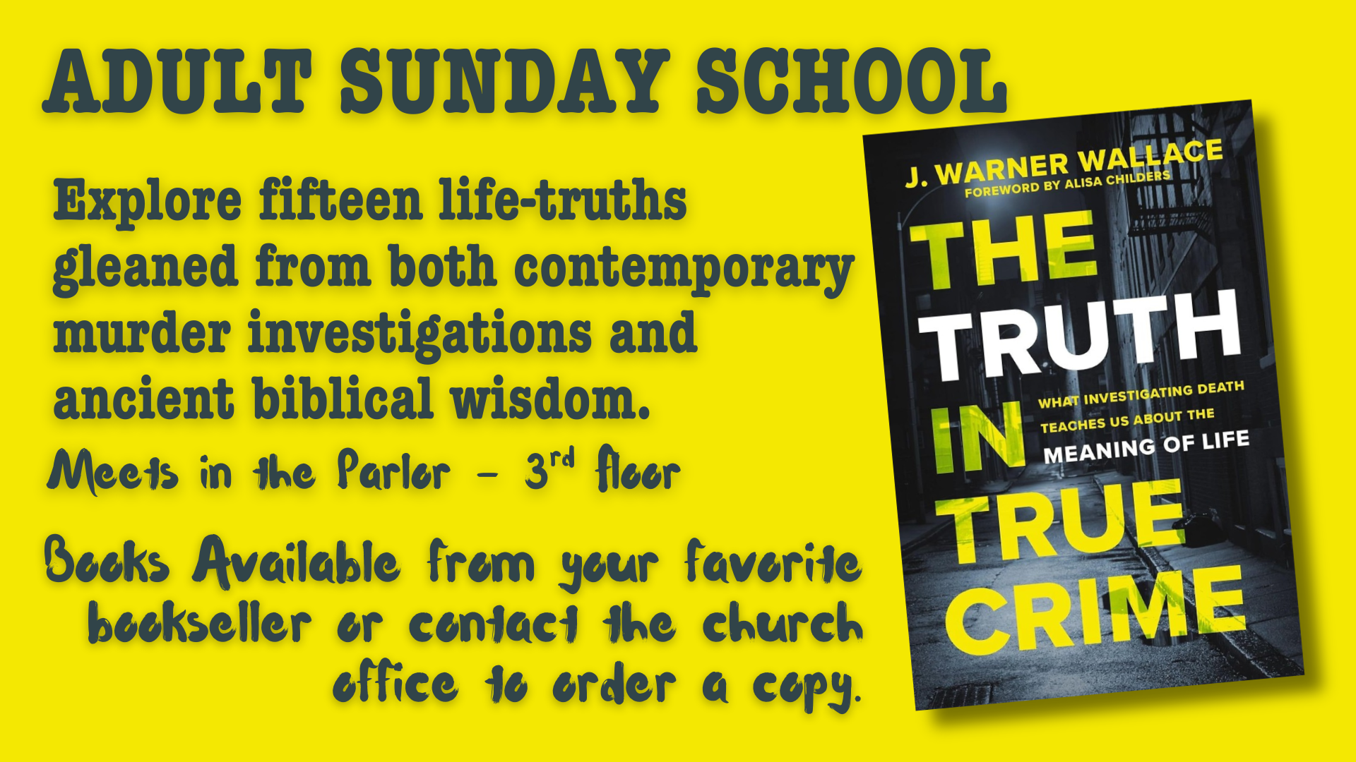 Date Sep 14 2025 Expired! Time 10:30 am - 11:30 am Adult Sunday School-Fall 2025 Adult Sunday School – Fall 2025 “The Truth in True Crime” Exploring 15 life-truths gleaned from both contemporary murder investigations and ancient biblical wisdom. Books available from your favorite bookseller or contact the office for a copy. Share this event + Add to Google Calendar + iCal / Outlook export The event is finished.