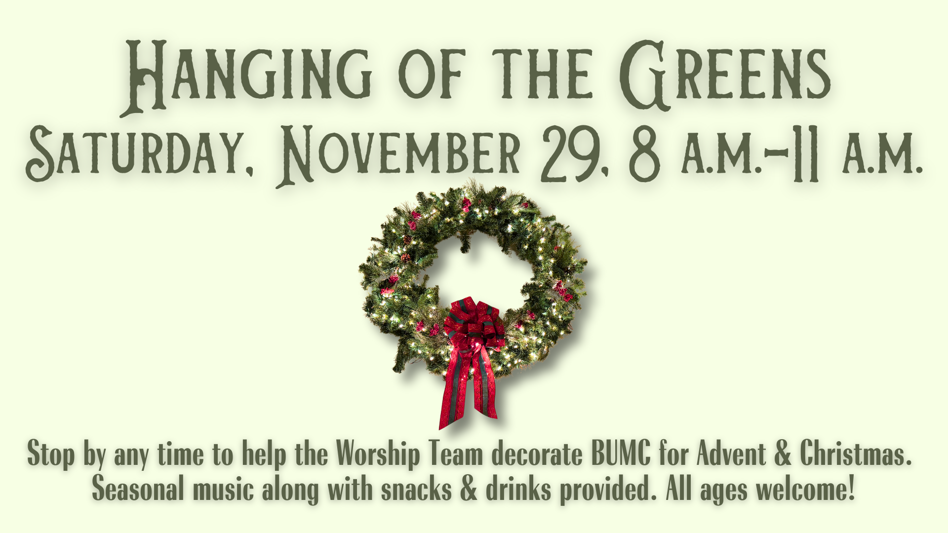 Date Nov 29 2025 Time 8:00 am - 11:00 am Hanging of the Greens 2025 Seasonal music along with snacks and drinks provided. All ages welcome! Share this event + Add to Google Calendar + iCal / Outlook export 00 days 00 hours 00 minutes 00 seconds