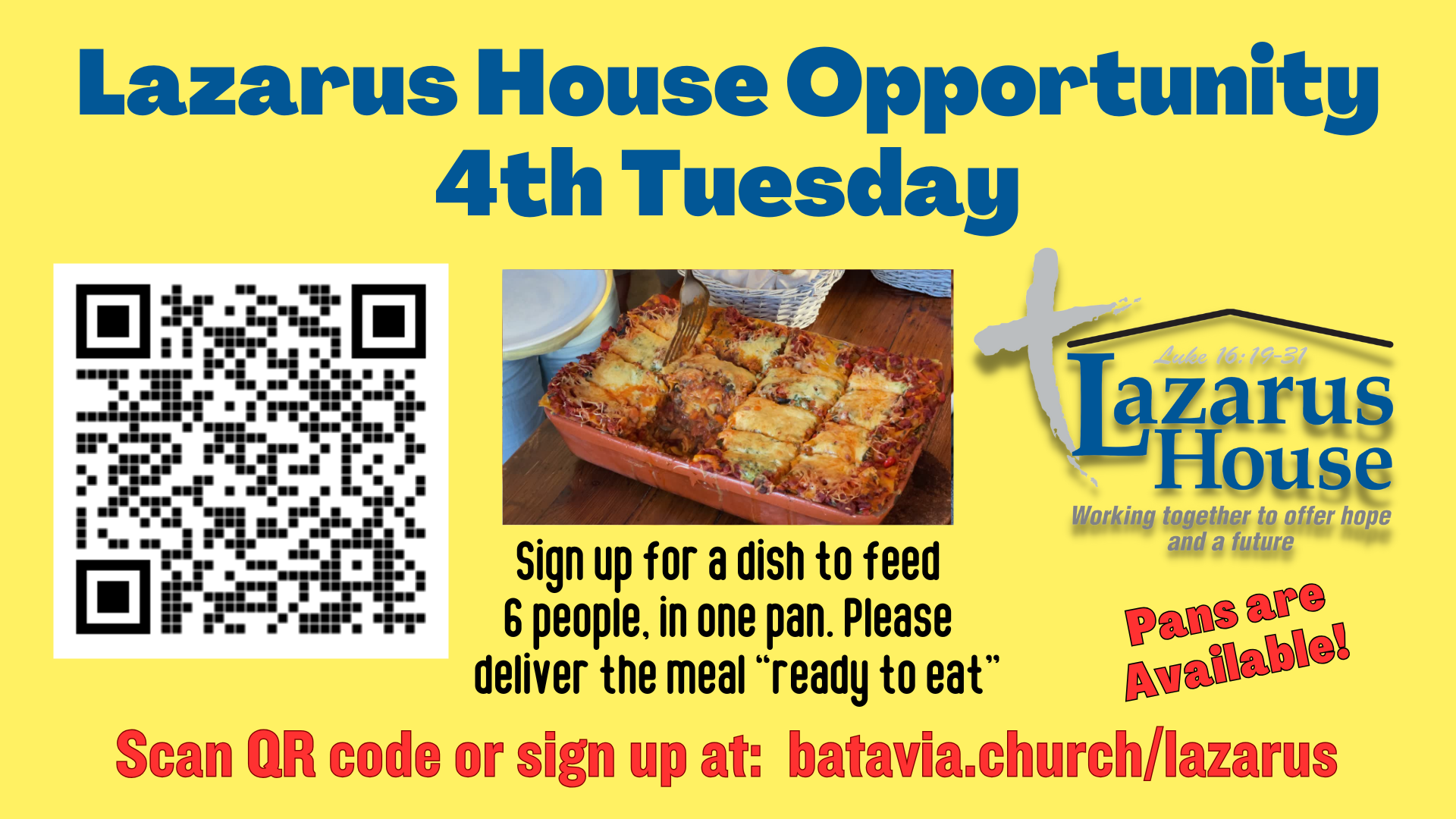 Please consider “shopping” at Lazarus House for meat and pans. Lazarus House receives many donations of meat that can be used. They will also provide aluminum pans for you to use as well.